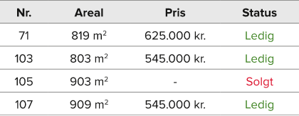 Grundene sælges UDEN byggepligt. Priserne er ekskl. tilslutningsafgift til el, vand og fjernvarme. Prisen er inkl. moms.
